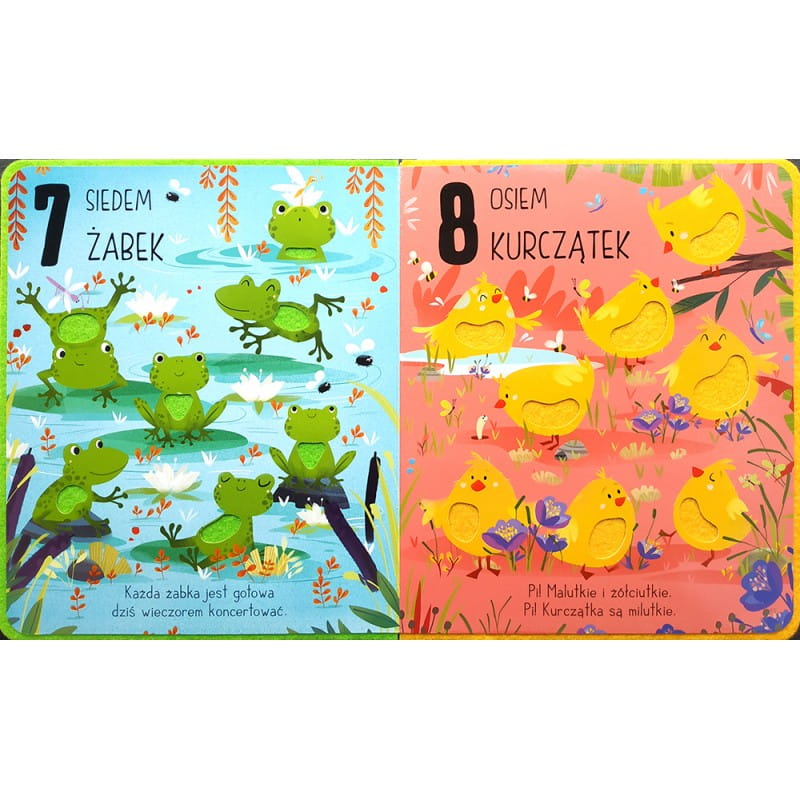 Lekka i miękka w dotyku książeczka sensoryczna z pewnością spodoba się małym odbiorcom. Piękne ilustracje i odpowiednie dla dzieci wierszyki zachęcają do oglądania, nauki kolorów i liczenia, a dotykanie miękkiego filcu uprzyjemnia zabawę i stymuluje zmysły maluchów.
